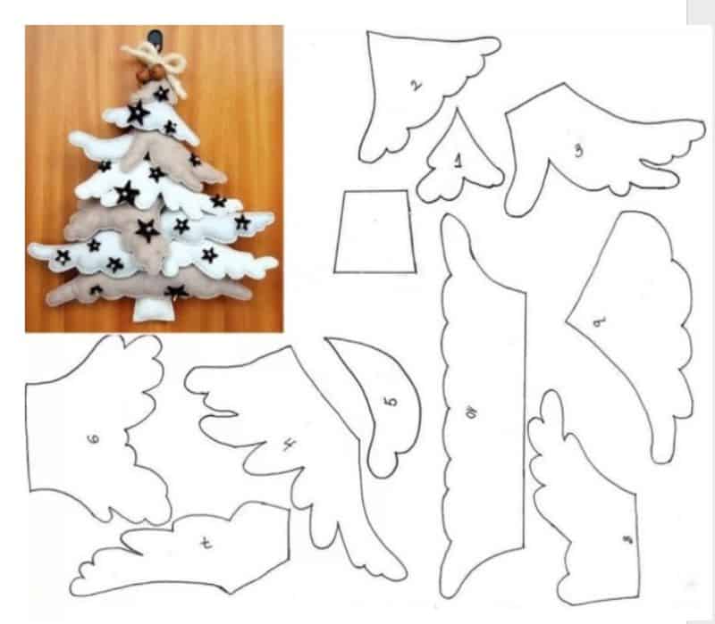 - Нарисуйте контур елочки, перенесите его на фетр и вырежьте. Приклейте фигурку на основу.