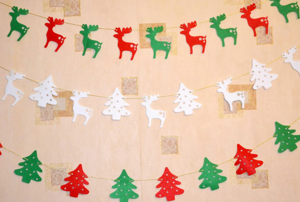 Фетровая гирлянда — очень легкий способ поделки для начинающих. Аппликацию делают в форме оленей, единорогов, елочек, снеговичков и различных елочных игрушек.
