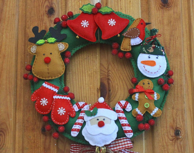 Елочный венок | Фетр зеленого цвета, нитки, игла, ножницы, декоративные элементы (бусины, ленты) | Средняя |