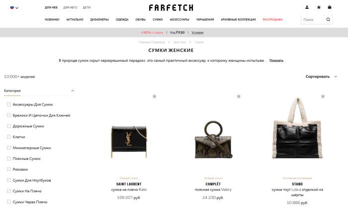 В мультибрендовом интернет-магазине Farfetch можно приобрести аксессуары от известных домов моды и более демократичных марок. В разделе сумок представлены более 10 тысяч моделей разных видов: тоут, клатчи, поясные, миниатюрные, деловые, рюкзаки, на длинной ручке, дорожные, а также аксессуары, брелоки и цепочки для ключей. Ценовая категория магазина – премиум.