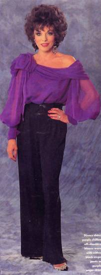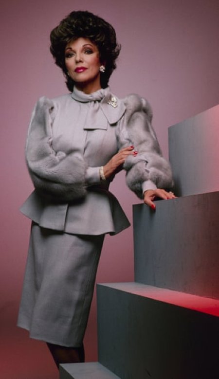 Джоан Коллинз: Знаковая фигура Джоан Коллинз, известная как Алексис Колби из сериала «Династия» 1980-х, вдохновила множество женщин на создание объемных причесок. Она продемонстрировала, как носить широкие плечи и яркие узоры, а также как правильно использовать яркие тени для век и румяна. В сочетании с классическими блузками ее наряды стали символом стиля для работающих женщин, которые начали конкурировать с мужчинами на равных в 80-е.