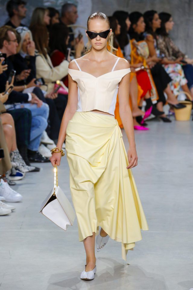 Юбки: среди них можно встретить плиссе, модели со сложным кроем, воланы, фатин, цветочные и абстрактные принты, асимметричные формы, запах, миди и легкие макси.