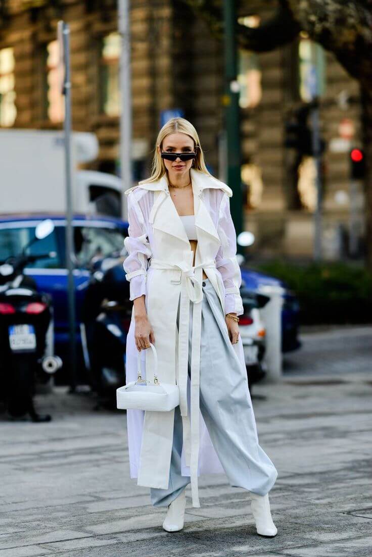 Верхняя одежда: стильное летнее пальто, кардиган, пиджак, косуха, джинсовая куртка, тренчкот, бомбер. Брюки: легкие или объемные (палаццо, бананы), женственные кюлоты, клеш, скинни, ⅞, с талией типа paper bag, яркие или с принтами.