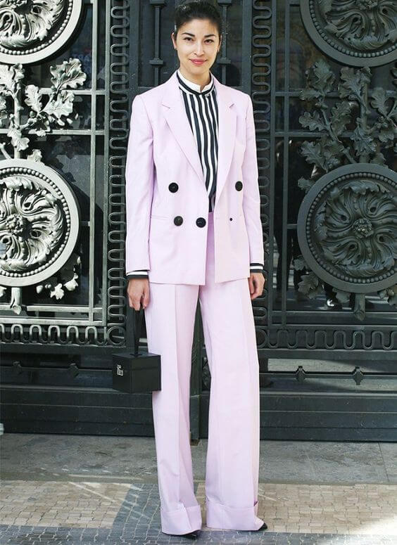 - брючный костюм розового цвета с удлиненным жакетом;