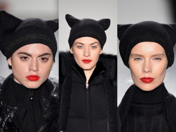В сезоне осень-зима 2018-2019 года шапки с декором в виде «ушек», ранее популярные среди детей, привлекли внимание взрослых. Эти головные уборы востребованы как в классическом полукруглом дизайне, так и в современных трендах с изображениями животных. На фотографиях ниже представлены стильные модели от известного американского дизайнера А. Суи.