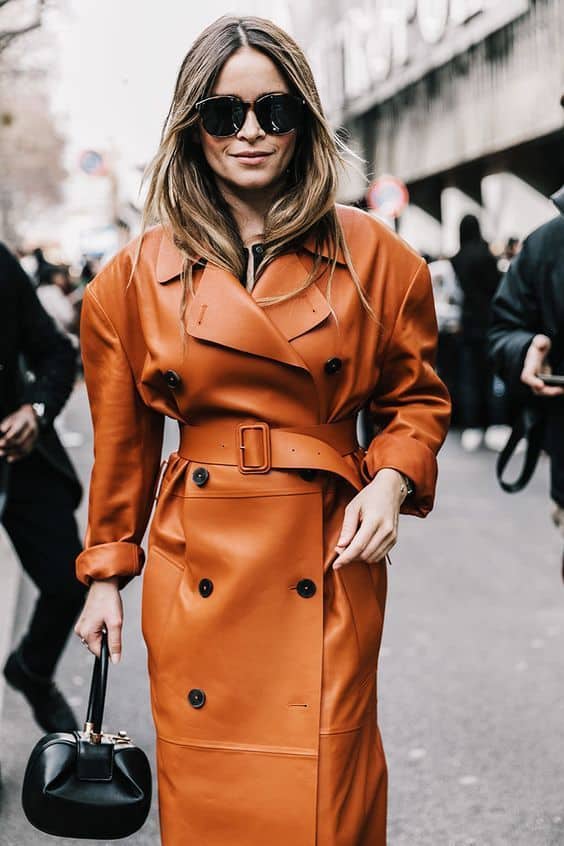 Такие модели остаются востребованными в любой длине, однако особенно популярны кожаные двубортные плащи черного, коричневого и бежевого оттенков. Чтобы подчеркнуть женственный силуэт, используйте пояс в тон, а в качестве обуви выбирайте остроносые модели на каблуке.