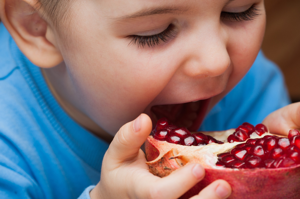 Некоторые детские врачи разрешают употребление зерен с двухлетнего возраста, а кто-то — после 7-ми лет. Контролируйте количество съедаемого. Сначала порция равна четвертинке фрукта, к 4 годам половине. Существует мнение, что к школьному возрасту можно кушать 2 средних граната в неделю.