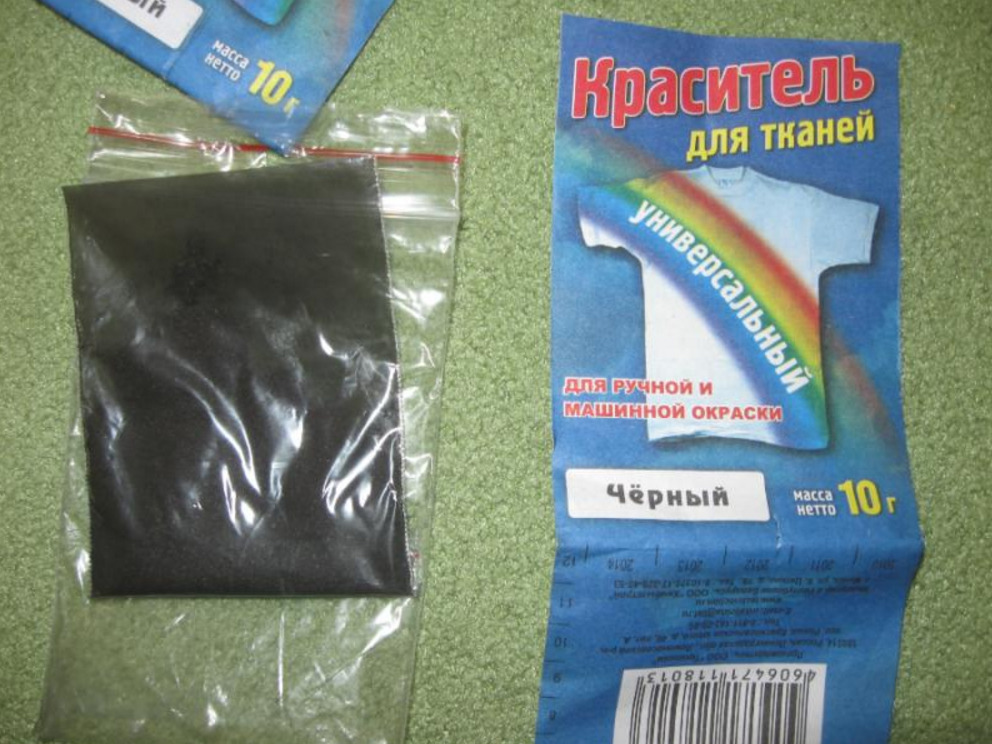 Перед окрашиванием обратите внимание на материал. Для синтетических тканей подойдут химические красители. Если планируете менять цвет в стиральной машине, добавляйте краситель в пропорции 1 кг на 1 пакет текстильной краски.