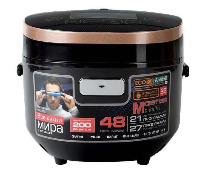 Емкость в пять литров с антипригарным покрытием позволяет готовить диетические блюда без масла при жарке и тушении. Максимальная температура приготовления — 160 градусов. Вес прибора — 5,765 кг. Мультиварка предлагает 34 режима работы, из которых 18 требуют ручной настройки.