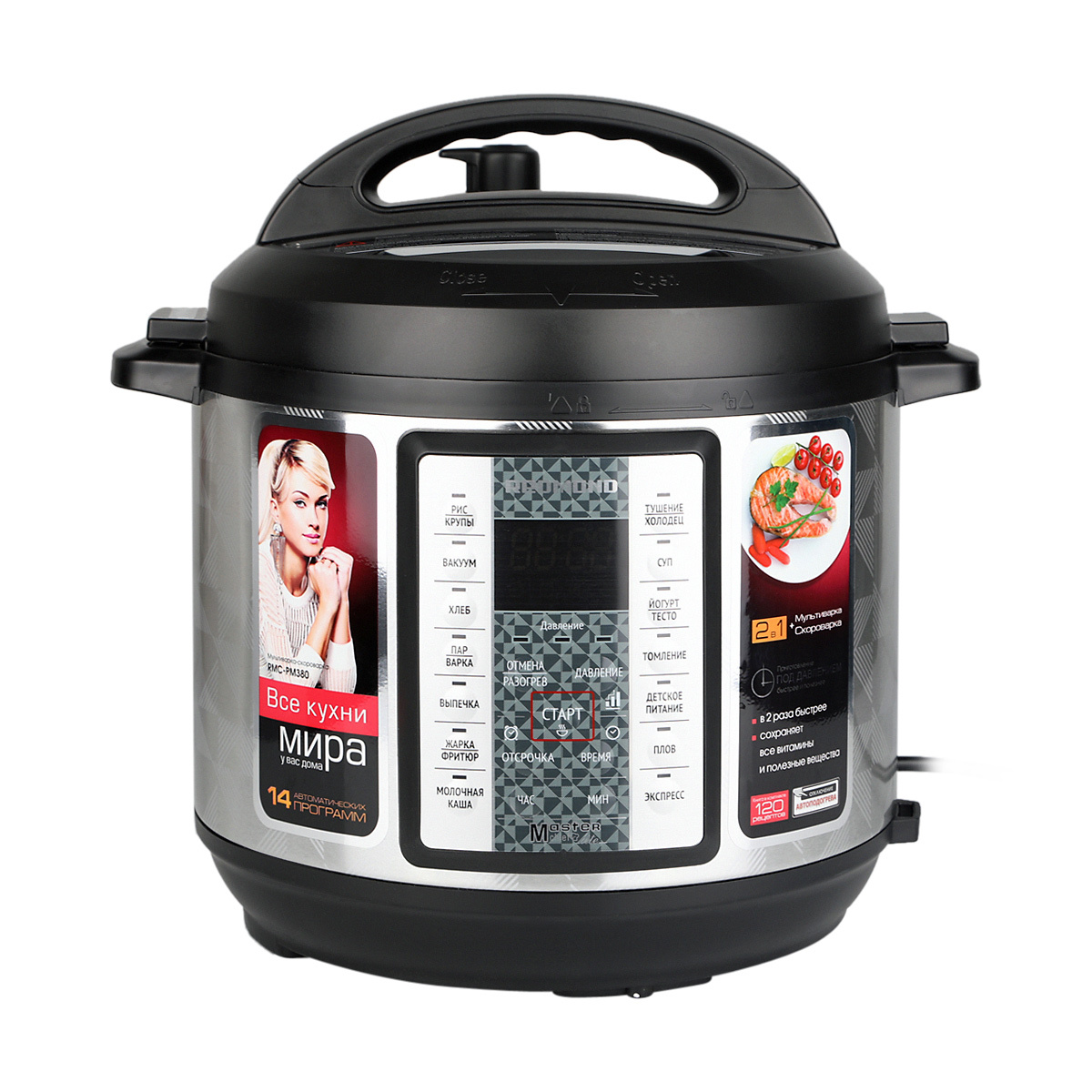Мощная бюджетная мультиварка с металлическим корпусом и чашей объемом 6 л. Модель имеет 14 режимов приготовления, функцию Мастер-шеф, защиту от перегрева и паровой клапан. Отложенный старт и отключаемый подогрев вкупе с возможностью готовки под давлением облегчает кулинарные задачи пользователя. Вес прибора — 6 кг.