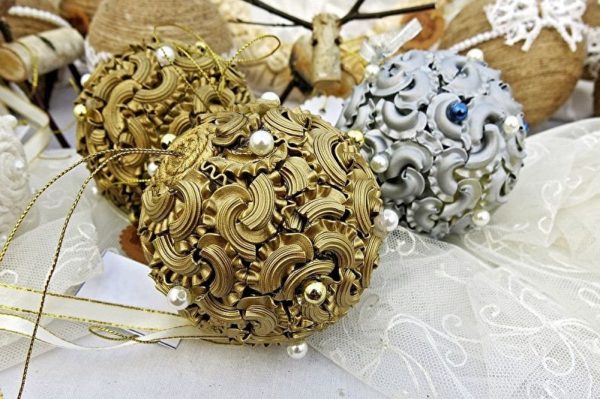 Можно сделать украшения, которые издалека будут неотличимы от готовых. А за счет декора придать им роскошный внешний вид и адаптировать под обстановку. Краску вы выбираете на свое усмотрение, а на следующий год можно перекрасить, если это потребуется. При хранении в сухом месте игрушки из макарон могут служить по несколько лет.