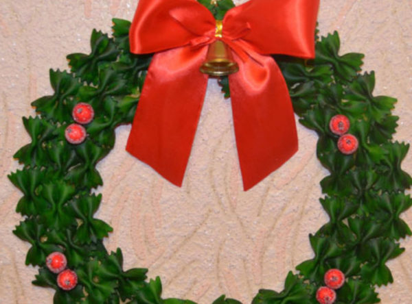 Этот несложный вариант поделки из макарон для детей на Новый год 2021 позволит сделать отличное украшение и даст волю фантазии. Для работы понадобятся макароны-ракушки для обрамления и другие разновидности для наполнения венка внутри. Также нужно заранее сделать основание по размеру венка: проще всего вырезать кольцо из плотного картона, его можно загрунтовать для придания прочности. Инструкция по изготовлению: