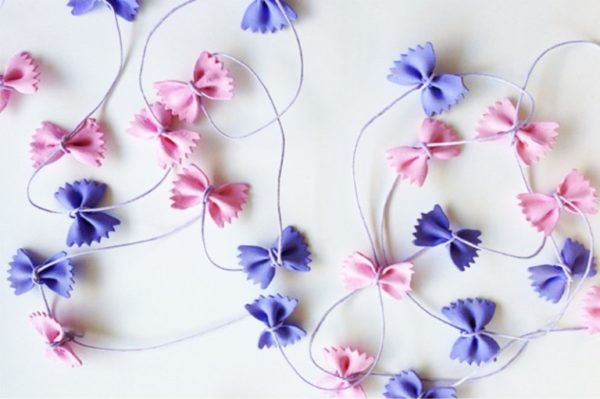 - Подберите вместе с ребенком те макароны, которые больше всего подойдут для изготовления гирлянды. Элементы могут быть одинаковыми или чередоваться в определенном порядке.