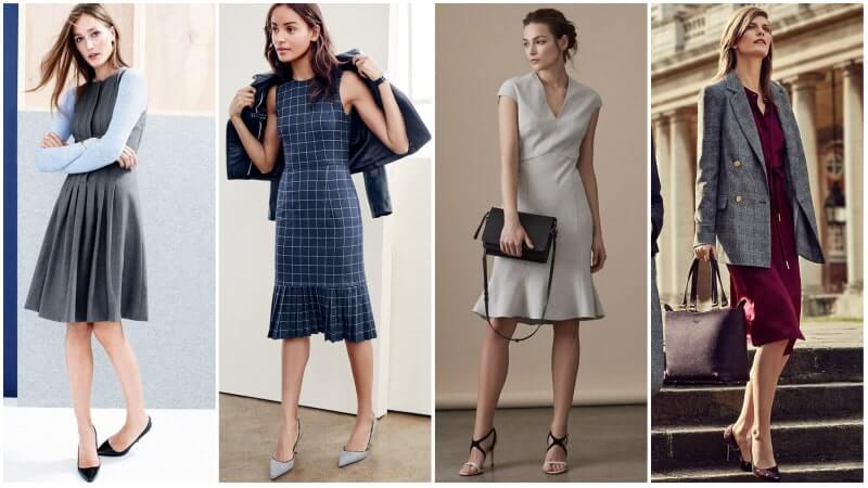Деловые платья должны сидеть по фигуре, но не быть слишком обтягивающими. Длина таких платьев имеет значение — они должны доходить до колен или быть чуть ниже, избегая излишней откровенности. В деловой среде предпочтительнее выбирать модели с короткими или длинными рукавами, однако платья без рукавов также могут быть уместными, если их дополнить рубашкой или свитером под низ и пиджаком сверху.