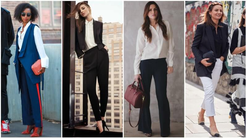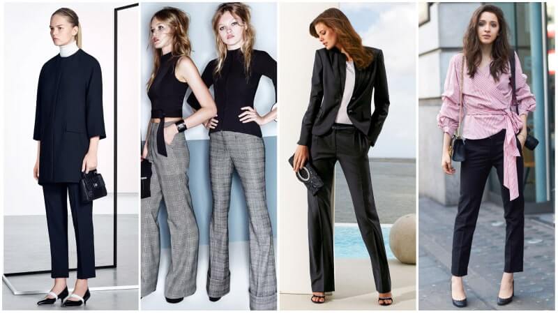Деловые брюки для женщин бывают разных видов, в том числе прямые, укороченные и «сигареты». При их выборе учитывайте свое телосложение и выбирайте тот фасон, который более всего подходит. Также помните о длине — если брюки слишком длинные, отдайте их портному, а не подворачивайте их. Что касается цвета, идеальны нейтральные оттенки, такие как черный, темно-синий и серый.