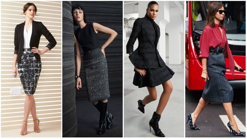 | Низ | Юбки-карандаш, прямые брюки, брючные костюмы. Длина юбки – до колена или чуть ниже. | Черная юбка-карандаш, серые классические брюки, брючный костюм темно-синего цвета. |