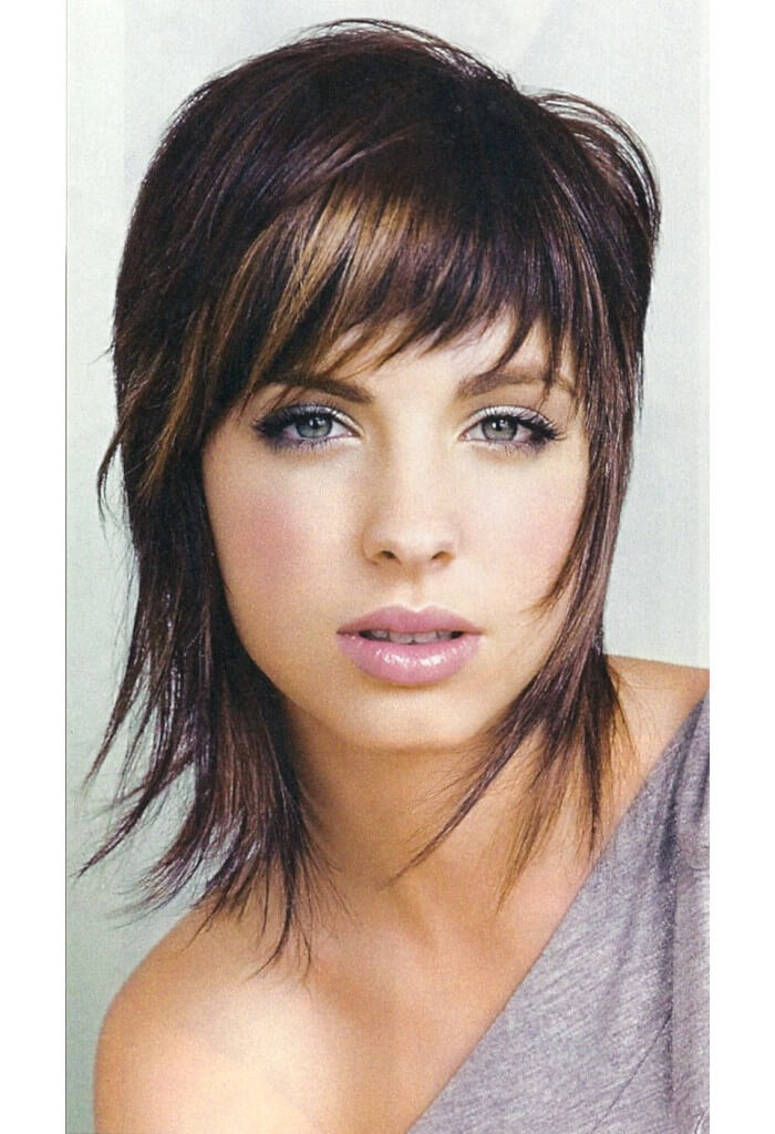 | Шэг с удлиненной челкой | Удлиненная, редкая | Многослойная, слегка растрепанная стрижка с длинной челкой, которую можно укладывать на две стороны. |