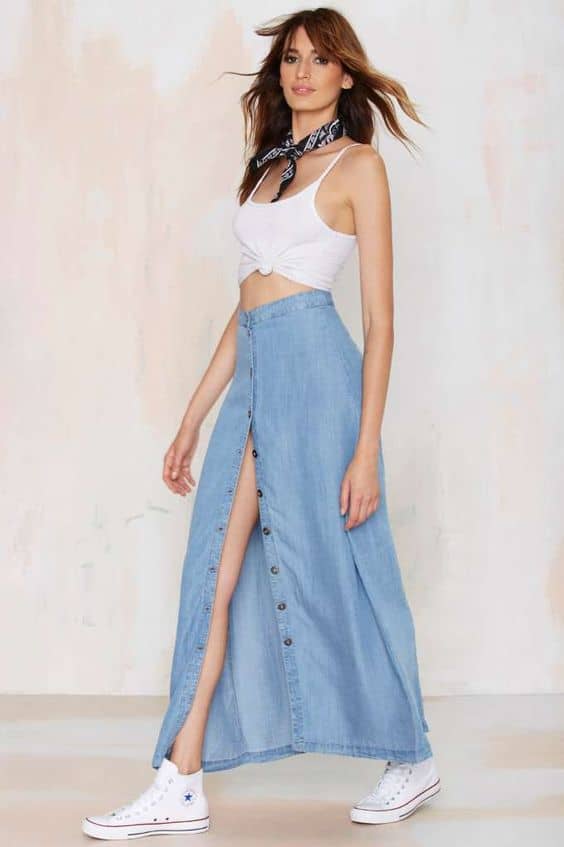 К ультрамодным джинсовым юбкам с пуговицами относится и макси-юбка, которую можно носить в летних образах с топами, майками и кедами.