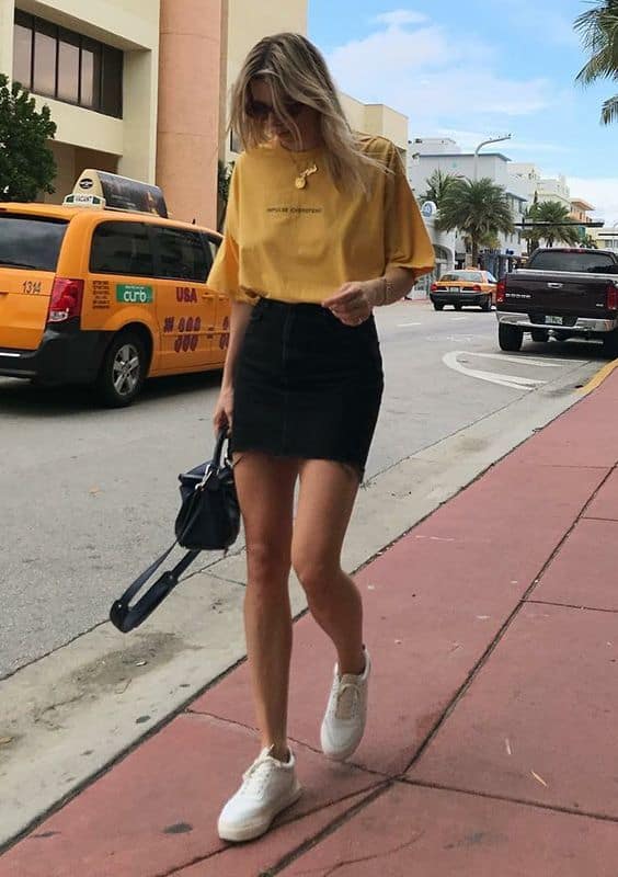 Черный цвет хорошо сочетается со всеми цветами без исключения. Это значит, что вы можете носить черные модели с футболками горчичного, серого, желтого, синего, белого и любого другого цвета, включая сам черный. Джинсовая юбка + футболка – одно из самых удобных и модных сочетаний, особенно, если в качестве обуви выбрать кроссовки или кеды.