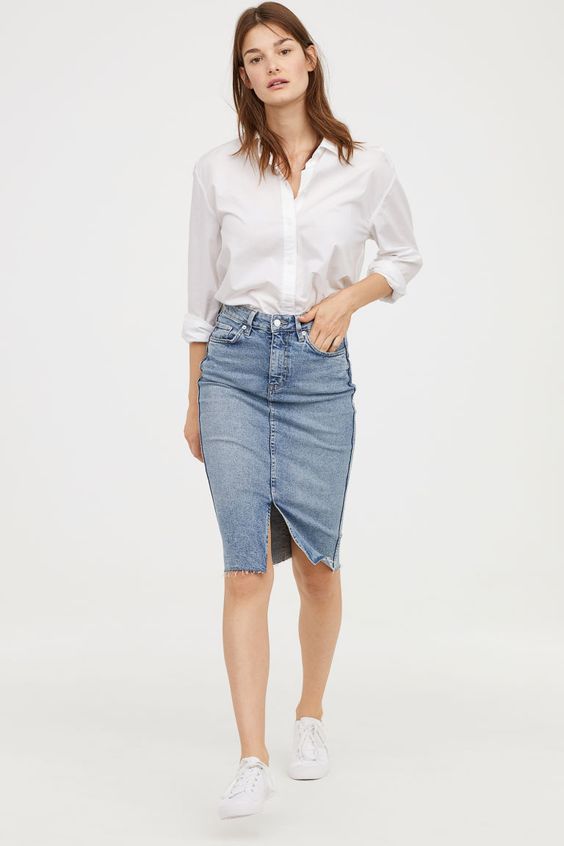 Ультрамодный образ получится, если надеть юбку-карандаш с белой блузой и обувью в тон. Белые лодочки или босоножки станут оригинальным дополнением к образу, где основное внимание уделяется дениму.