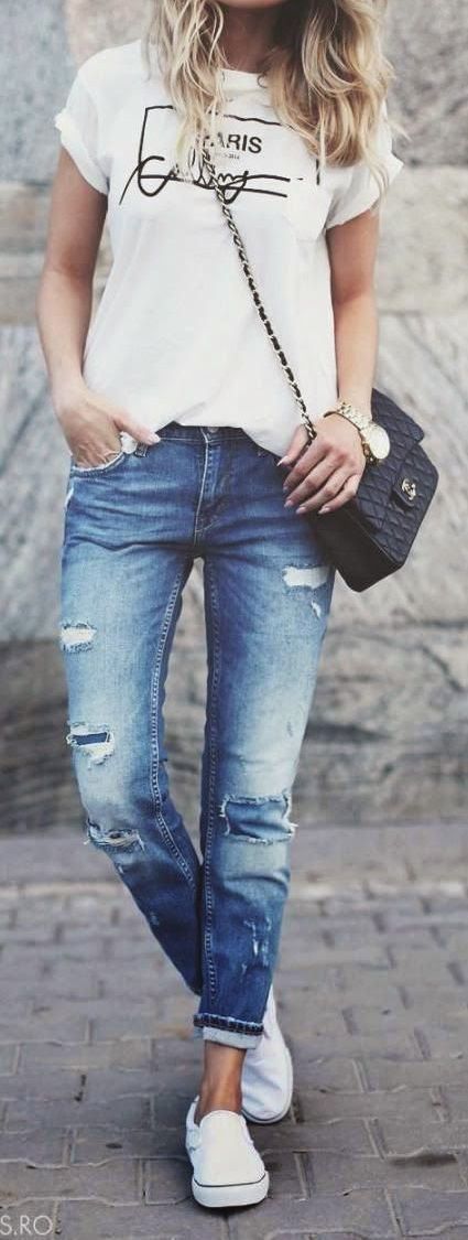 Джинсы-бойфренды с дырками не только стильны, но и очень актуальны в летнюю жару. Чем больше дырок, тем более модным будет ваш образ. Потрепанные края таких отверстий только приветствуются.