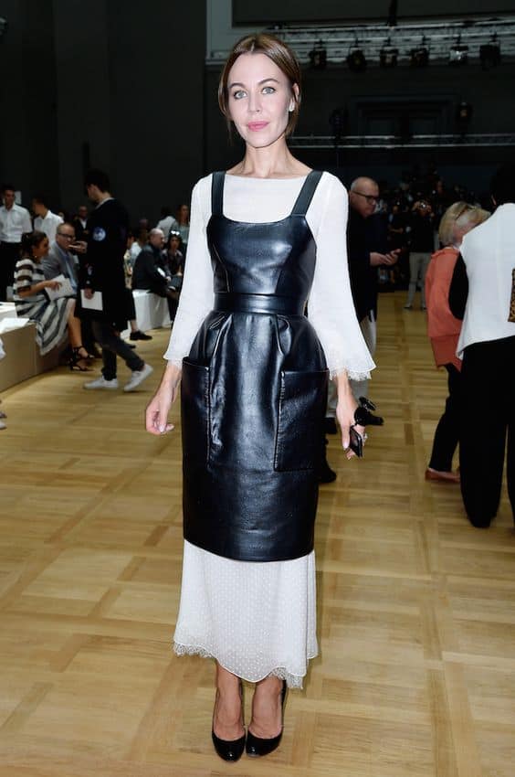 Но в этом правиле есть исключения, например, Ульяна Сергиенко создает модный образ с кожаными сарафаном и кожаными ботфортами с открытым носком одинаковой фактуры. Эпатажный лук дополнен платком в русском стиле и трикотажным джемпером. Ульяна выглядит ярко, выразительно и трендово – в самый раз на модное мероприятие.