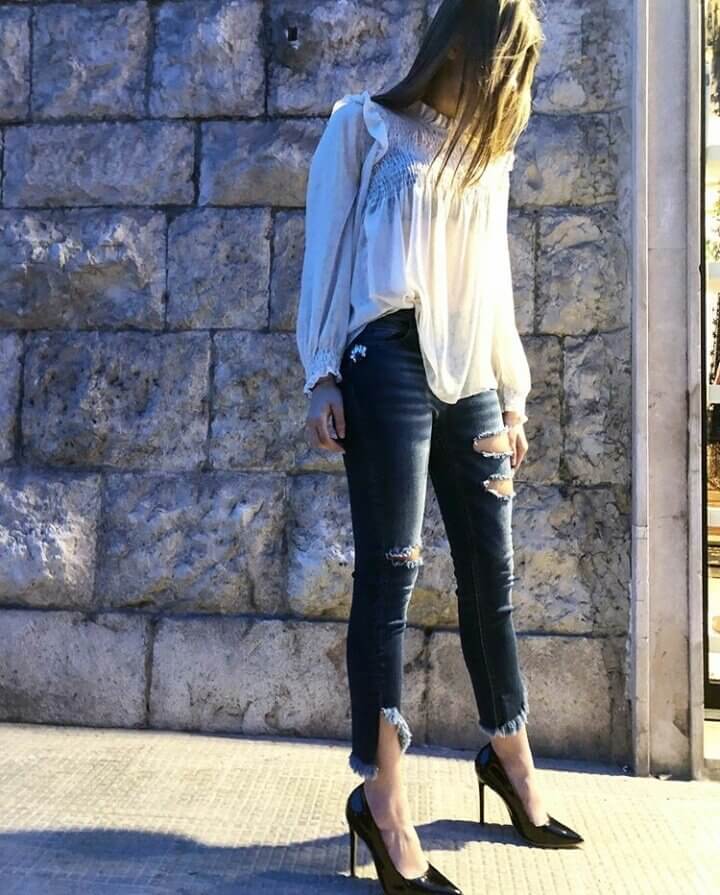 Сочетать рваные темно-синие джинсы с другими элементами гардероба гораздо проще, чем создавать образы с брюками прямого кроя или клеш. Рваные джинсы любого оттенка должны комбинироваться с вещами, которые помогут сбалансировать образ, чтобы избежать излишней небрежности. Отличным вариантом для темно-синих рваных джинсов станет комплект с боди, классической рубашкой и туфлями-лодочками, босоножками или ботильонами. Чтобы не ошибиться в выборе, лучше отдавать предпочтение базовым цветам.