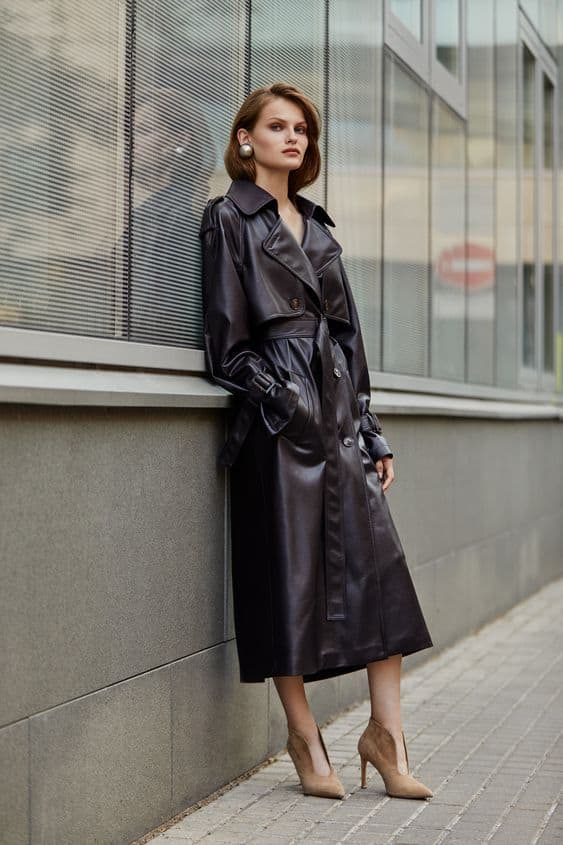 Свободный кожаный плащ длиной миди или макси идеально подходит для сочетания с изящной обувью на каблуке. Контраст между открытыми щиколотками и грубой кожаной текстурой создает женственный и соблазнительный образ. Многие модницы предпочитают носить кожаные плащи с короткими платьями и юбками, чтобы добиться именно этого эффекта.