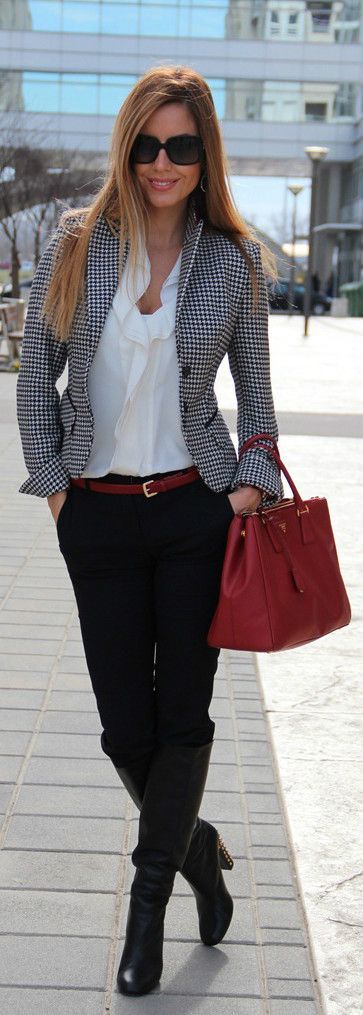 | 1. Деловой шик | Серый пиджак, белая рубашка, черные брюки-дудочки | Туфли-лодочки, минималистичные серьги, часы |