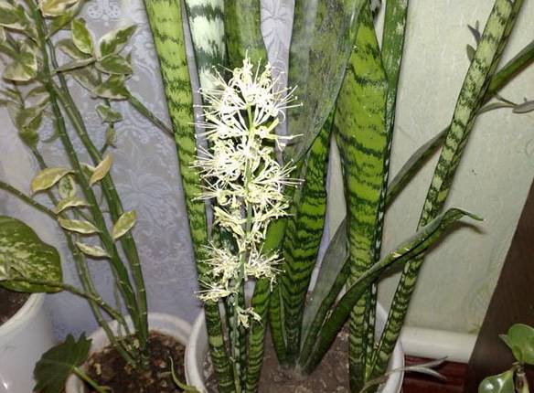 Если вы хотите понять, как определить, цветет растение или нет, то обратите внимание, пустило ли ваше растение продолговатую стрелку. Маленькие цветочки, которыми сопровождается цветение сансевиерии, выглядят просто очаровательно на фоне темно-зеленых листьев.
