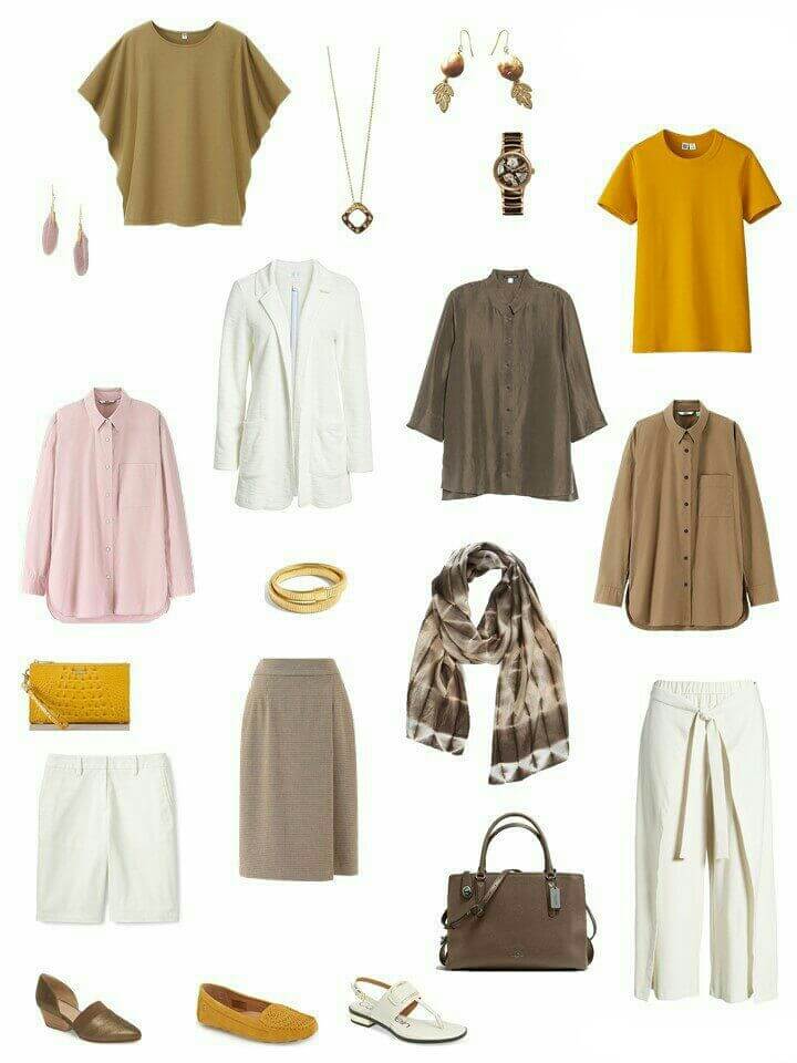 - Для каждой части своей жизни и для каждого сезона (весна, лето, осень, зима, можно добавить межсезонье) создаем основу в пропорции: 1 низ + 2 верха и аксессуары, причем многое зависит от предпочтений и сферы (для студентки 33 пары джинсов — это нормально, а для офиса одной пары будет достаточно); низ (брюки, юбки, шорты, платья, костюмы, комбинезоны), а верх (блузки, рубашки, топы, майки, футболки, кофты, худи, свитшоты, куртки, пальто, кардиганы, плащи, жилеты, жакеты, пончо и т.д.);