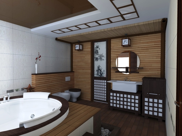 В ванной комнате в японском стиле обычно устанавливают душевую кабину прямоугольной формы и бочку-фуро. Освещение должно быть мягким и рассеянным. Мебель предпочтительно выбирать из натурального дерева или его качественной имитации.