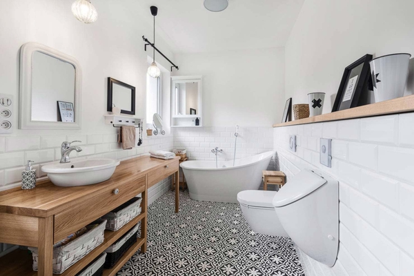 Если встает выбор между ванной и душем, скандинавы предпочтут душ, так как считают, что лучше мыться под проточной водой. Чтобы сэкономить площадь применяют подвесные раковины, биде. Разнообразить интерьер ванной можно при помощи текстиля, полотенец с инициалами, на пол постелить коврик с геометрическим узором.