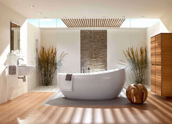 Избегайте стеклянных и хромированных элементов; лучше выбрать керамическую плитку, имитирующую натуральные материалы. Потолок окрасьте в нейтральный цвет, сложные конструкции здесь неуместны. Пол можно оформить керамогранитом или деревянными панелями, дополнить вставками из камня, образующими дорожку к ванной или обрамляющими пространство.